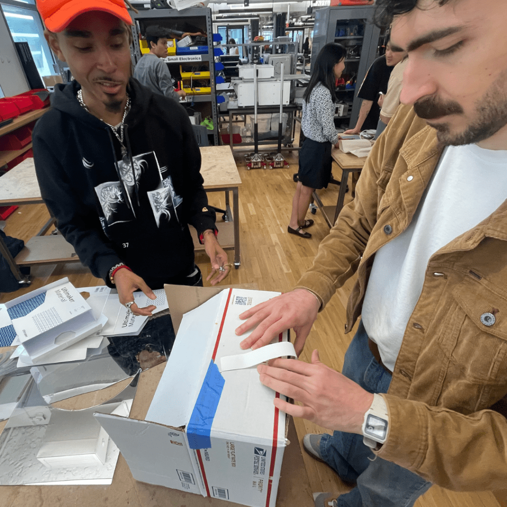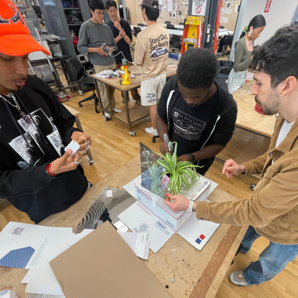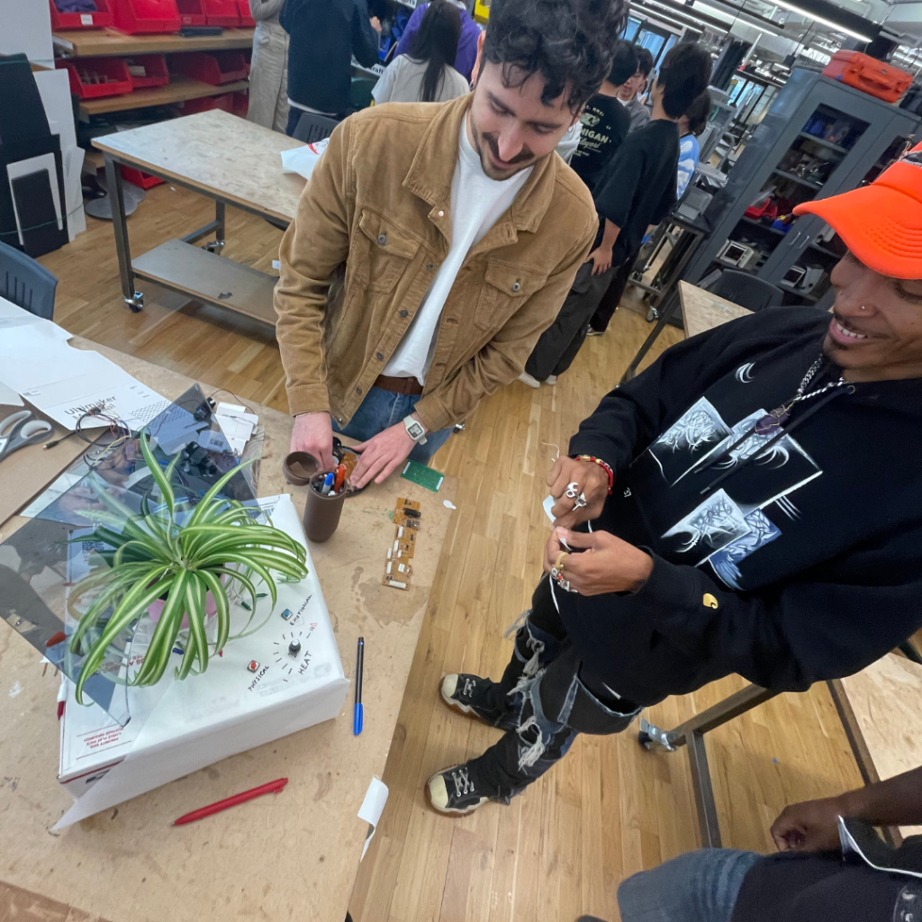 Once we found the central point of the design it was much easier to design a proposed system. Within 30 minutes we transformed a cardboard box, white paper, buttons and knobs, circuit boards, mirrored acrylic, and colorful holiday lights (thanks to the quick thinking and electrical skills of Justin!) into a fully designed insult machine- The Humbler 5000.