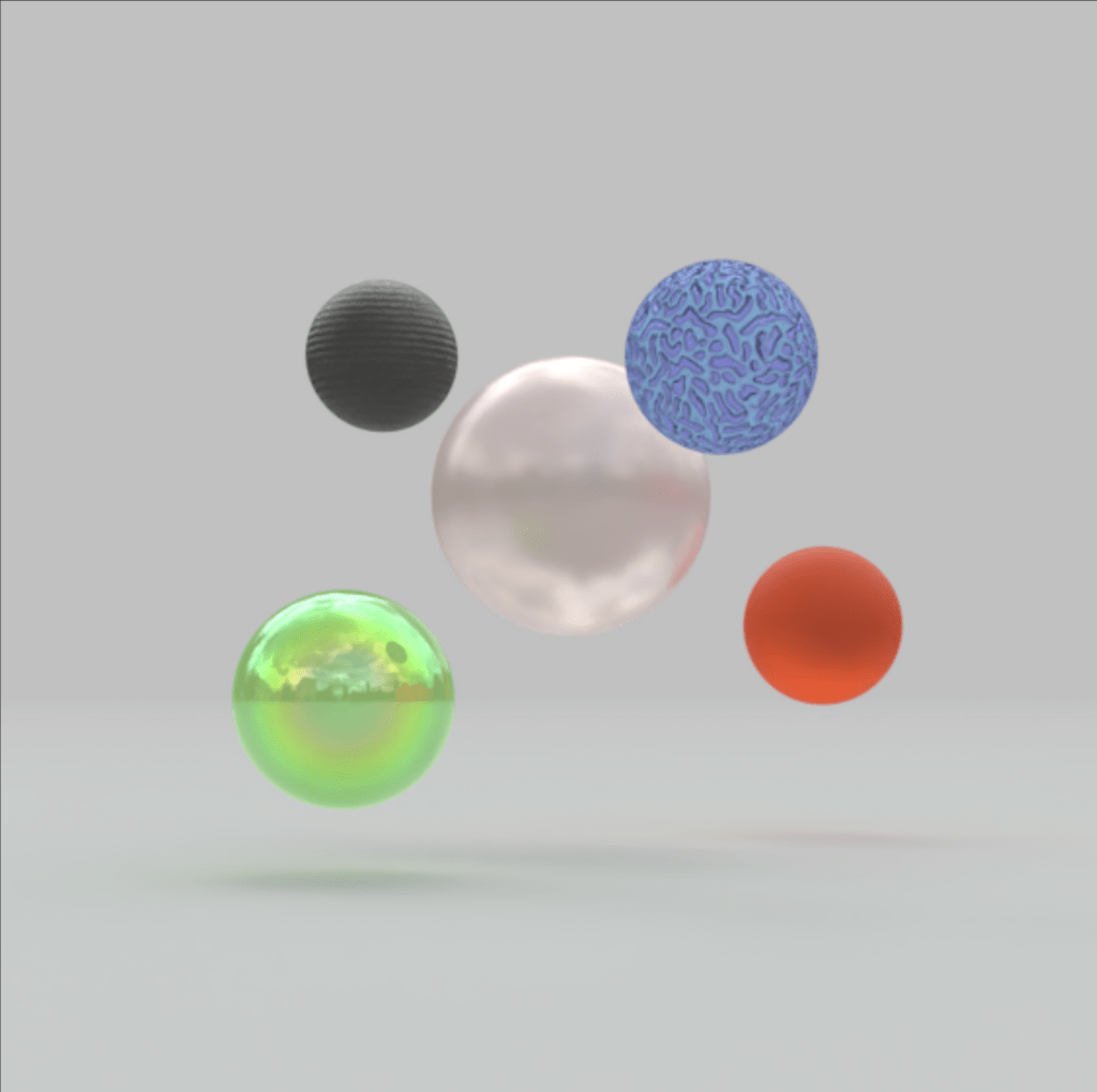 Next, I decided I wanted to play with the colors with an emphasis on texture. I went into a program called Womp and created various balls. After including the colors, I edited the materials used to create different contrasts in texture with the color. It was interesting to see how different materials could also influence how a color looked and belonged with the others. For some of the colors, choosing specific materials would change the appearance of the color so much that it almost didn’t appear to go with the original swatch I had chosen.