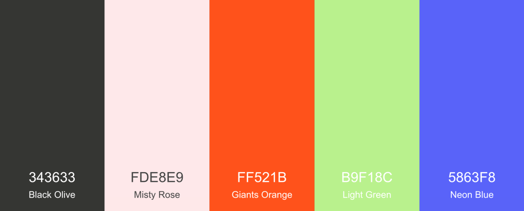 For my colors, I decided to go with a bright and fun pallet that included some of my favorite colors- purple, orange, and green. Because I picked such vibrant versions of those colors, I opted for some muted supporting colors. I didn’t want to go with a boring black and white, so I instead chose a warm grey and very light pink that I felt were simple yet still visually engaging. I used a an online color generator called coolors which I had used before in undergrad that helps you build out cohesive color pallets easily.