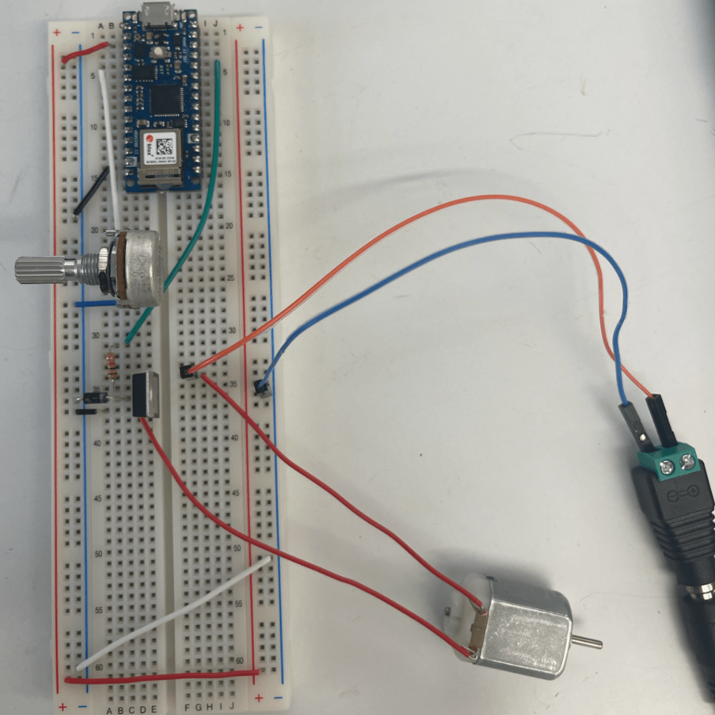 I was getting power both through the Arduino and the DC power source but the motor would not turn on. I tried a different motor and motor driver and that still didn’t work. After coming back from a walk because I was so frustrated I realized I had switched the order of two of the connecting wires in the schematic drawing and it finally turned on.