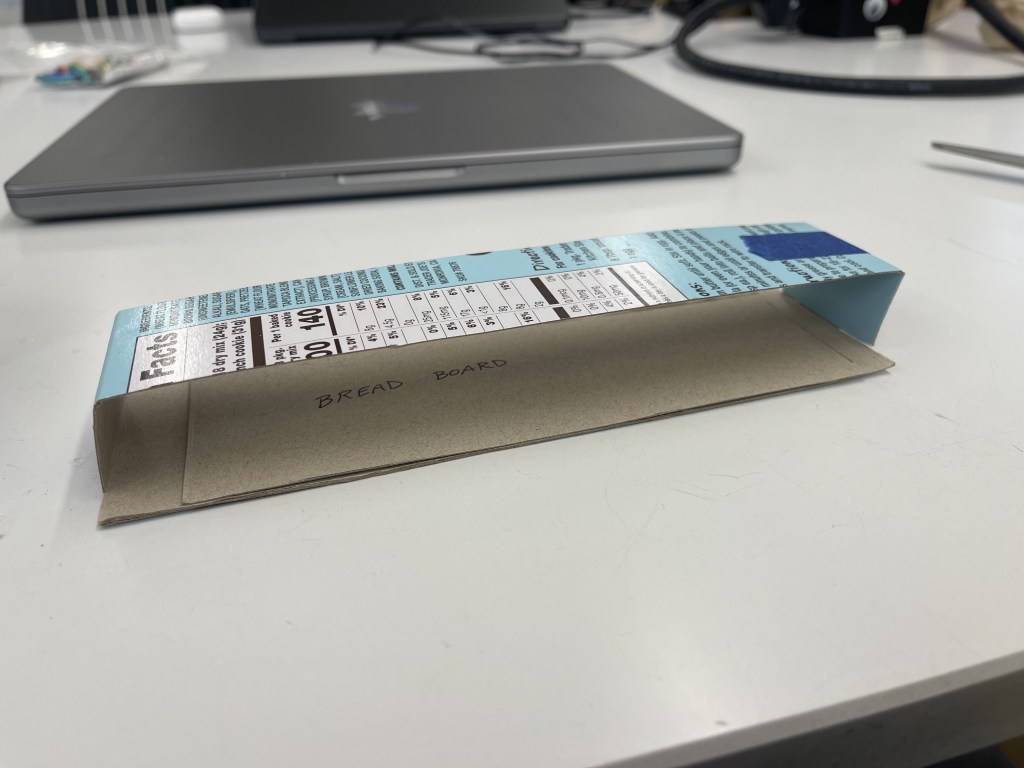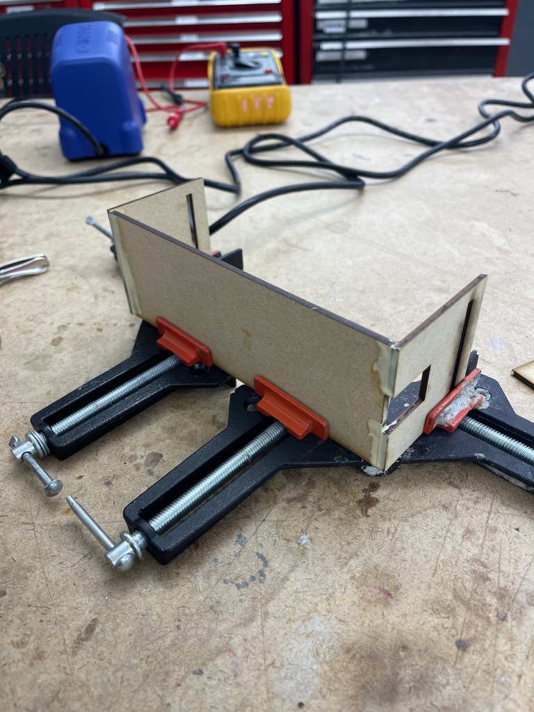 We then used wood glue and clamps to put together the box that would house the bread board as well as all the components. We were both afraid of wires coming undone or something disconnecting so we made a simple box that allowed a platform to slip into the sides of the box and have the buttons and potentiometers sit on top of the bread board without getting in the way.