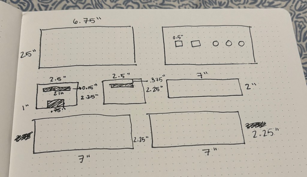 I took the lead on fabrication which was a little intimidating at first as I have not used a lot of the machinery in the shop yet. We had to pivot on our original fold out VJ set up and took some time to create a new little box. I quickly prototyped a sample idea out of cardboard so that we could see it in real time and talk about what the positives and drawbacks of the design was. After some discussing of the design and measuring of all the components of the project, I went to work creating a layout of the pattern we would need for the laser cutter in illustrator.