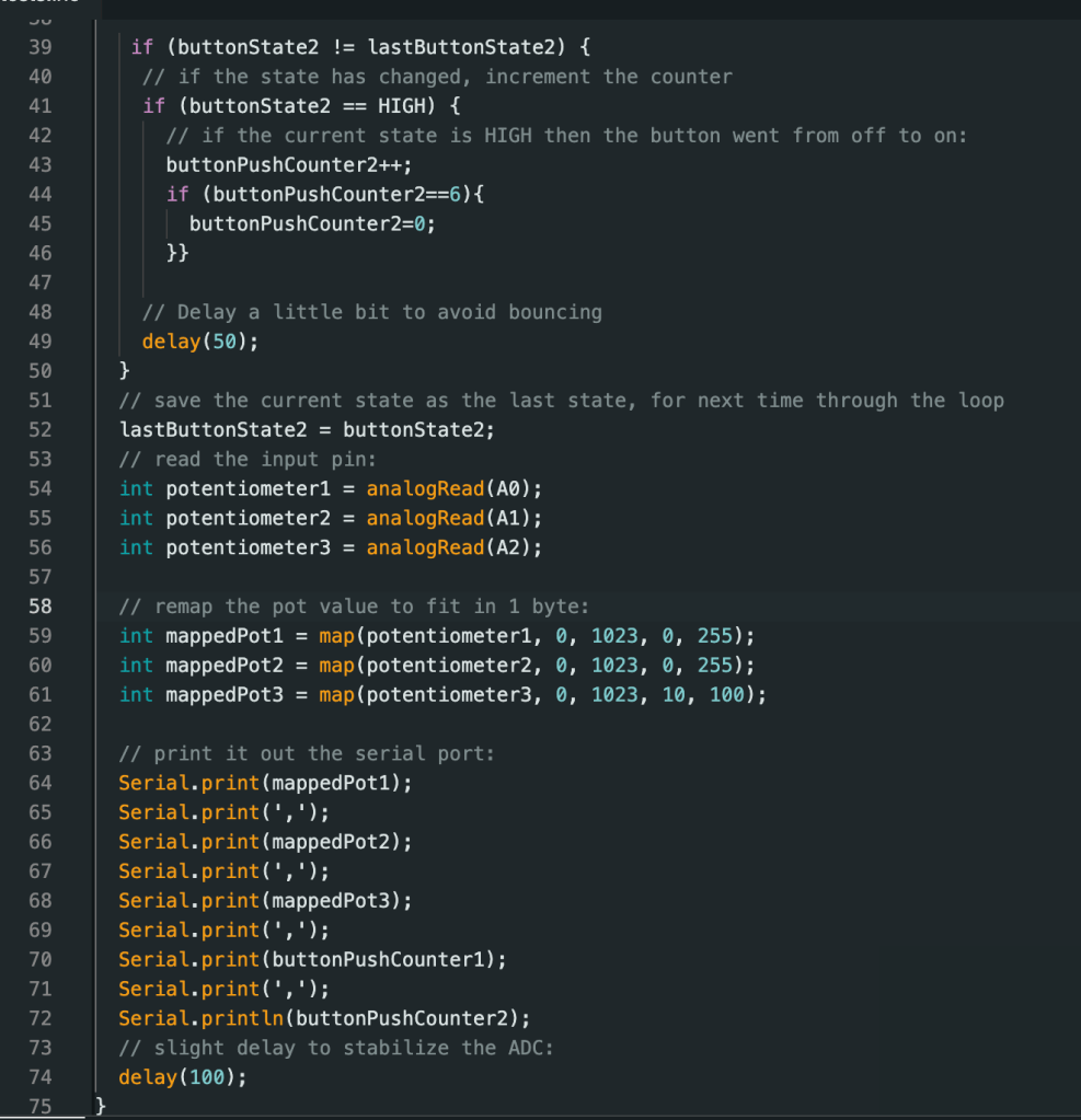 While we originally wanted to run something local, we ended up just replicating labs that are upcoming later in the semester in order to connect the Arduino to p5.js. It took some time to learn the structure of how to set everything up and get the Arduino and p5.js code to communicate. Then we had to splice multiple variables so we could change more than one thing in the p5 sketch.