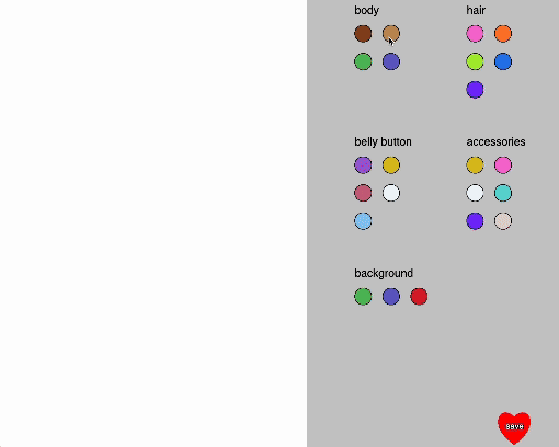 I then had to pivot to using buttons to load the various character customization options. I created circles under each category that can be used to customize the troll doll. Just as each item had to have a corresponding variable, each activated image option also had to have a variable.