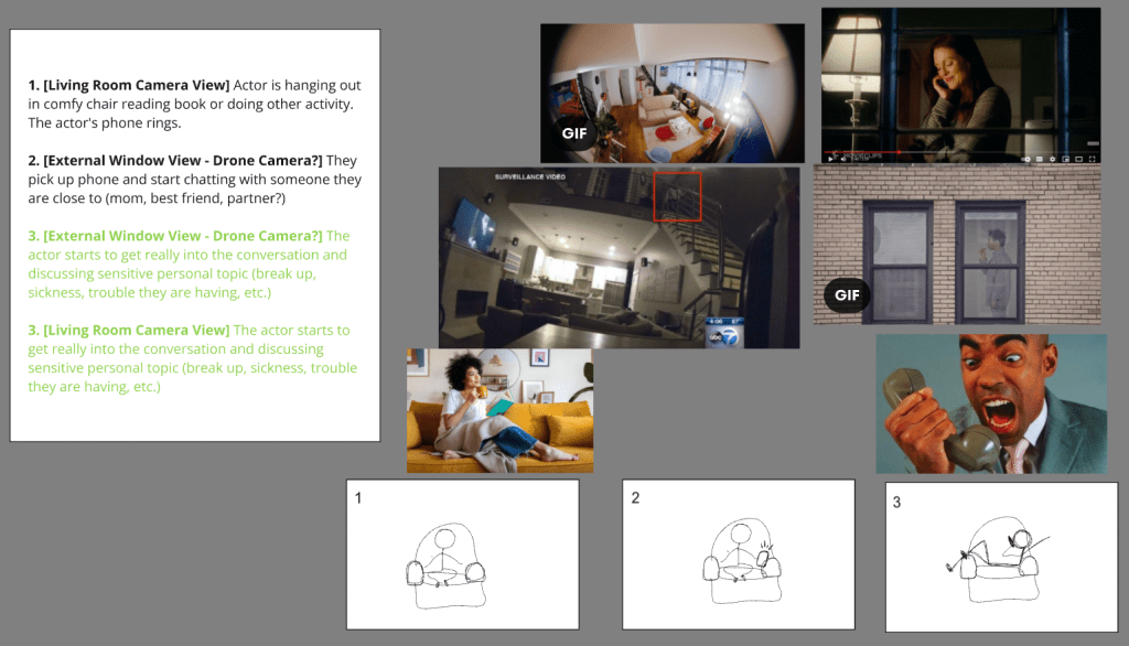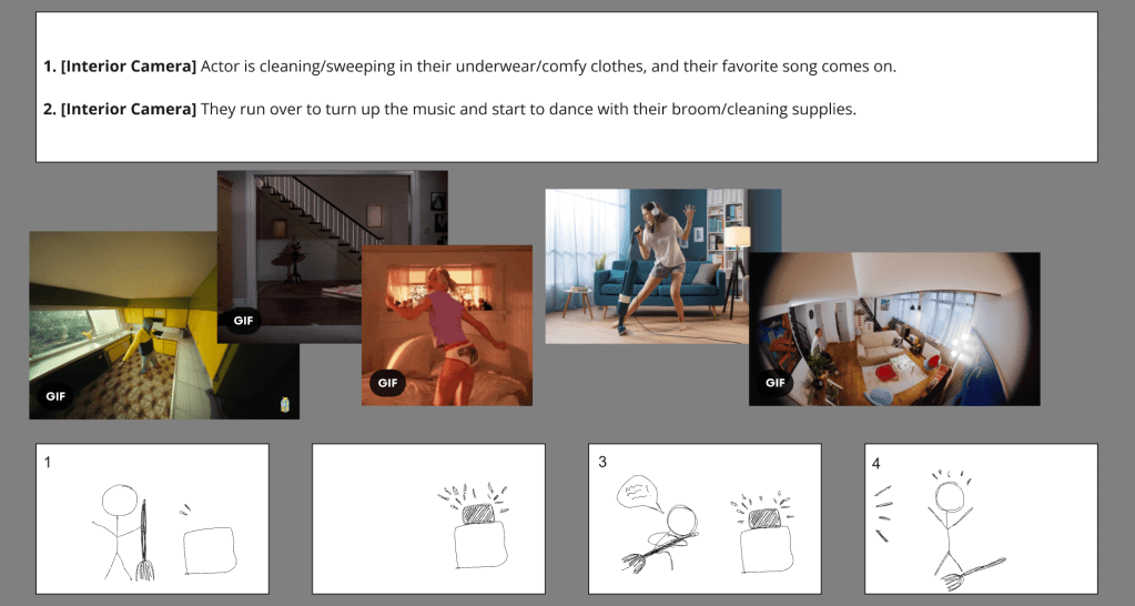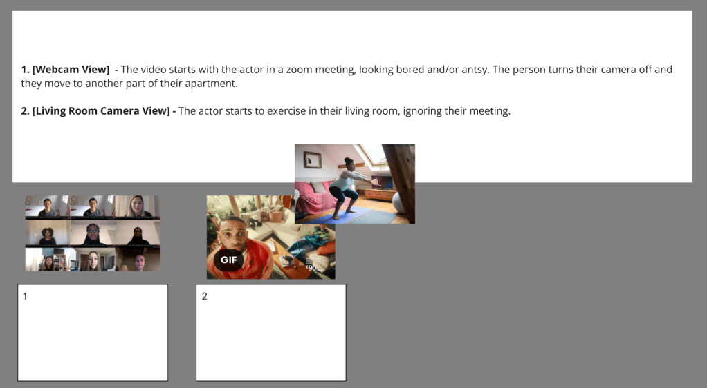 The situations we are planning to film include dancing at home in loungewear to a favorite song while cleaning, working out during what is supposed to be a work zoom meeting, a personal phone call, pigging out on a door dash delivery, personal grooming, and falling asleep with the tv on.